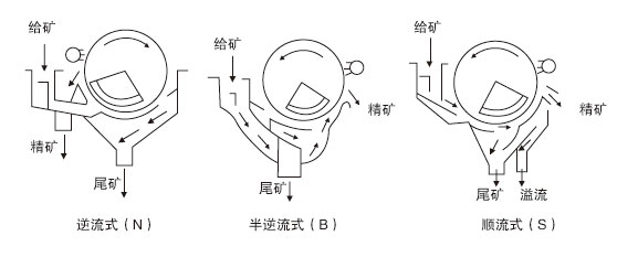 CTS、CTN、CTB系列永磁筒式磁選機(jī)磁場(chǎng)分旋轉(zhuǎn)式、固定式兩種機(jī)構(gòu),固定式主要適用于弱磁場(chǎng)濕式選別細(xì)顆粒的強(qiáng)磁性物質(zhì),或者除去非磁性礦物中的強(qiáng)磁性礦物,當(dāng)漿流入磁場(chǎng)區(qū)時(shí),其中強(qiáng)磁性礦物被吸附在圓筒表面,弱磁性和非磁性礦物被分選后排除,而吸附在圓筒表面的強(qiáng)磁性礦物隨圓筒的旋轉(zhuǎn)被帶出磁場(chǎng)區(qū)。旋轉(zhuǎn)式適用于細(xì)粒強(qiáng)(中強(qiáng))磁性礦物的干選,由于高速旋轉(zhuǎn)的作用,使磁性顆粒的磁滾翻次數(shù)大大高于普通磁選機(jī),這對(duì)于破環(huán)磁團(tuán)聚,提高富礦比具有顯著的效果,礦物經(jīng)分選后被分離成磁性物和非磁性物兩種,分別從各自的排礦口排出該機(jī),適用于礦石粒度為0.6-6mm的粗選和精選?!?同一圓筒可配三種槽體,即順流槽(CTS)選別粒度≤6mm,逆流糟(CTN)選別粒度≤0.6mm,半逆流槽(CTB)選別粒度≤1mm。