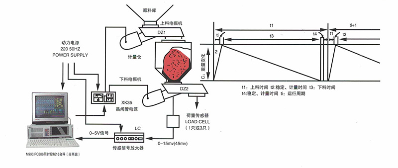 上料電振機和稱量斗是軟連結(jié)的,重力分離,下料電振機雖也是軟連結(jié),但其重力和稱量斗整體由三只拉力傳感器支撐的,由稱量斗內(nèi)料柱連結(jié)。工作時首先由上料電振機向稱量斗給料,當達到料倉給定重量的給定上限值時,停止給料。間隔一段時間后,下料電振機開始卸料,當卸料至給定的重量下限值時,停止卸料;如此重復動作。物料的流量計量是由料倉內(nèi)失去的物料重量多少來確定,因此叫失重定量給料機。